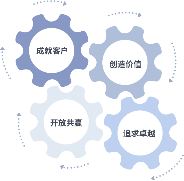成就客户是一切决策的出发点,,创造价值是衡量所有工作的标准,,,追求卓越是我们做事做人的态度,,开放共赢是我们的格局也是最终的结果。。。。价值观的齿轮环环相扣,,,,推动着组织里的每个人不断向前。。。。